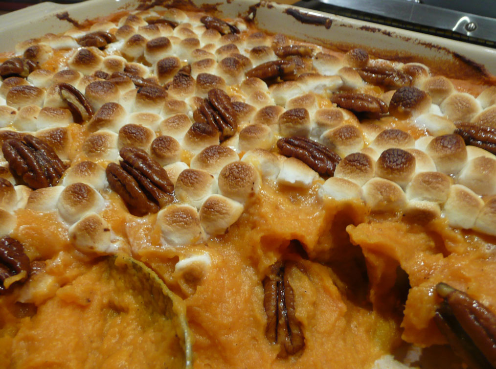 Scrape the potatoes into a 9×13 inch baking dish; scatter the marshmallows are golden. Sprinkle with the pecans and serve. MAKE AHEAD: The sweet potato puree can be refrigerated overnight. Bring to room temperature and top with the marshmallows bfore baking. The spiced nuts can be stored in an airtight container for up to 3 days. Makes 12 servings.